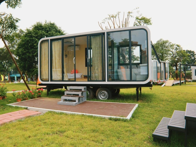 Prefabricated Cabin house, also known as a pod house, is a capsule residence that combines natural aesthetics with modern technology. Offering a variety of sizes including 10ft, 20ft, and 40ft, the standard layout includes a 1-bedroom, 1-kitchen, 1-living room, and 1-bathroom apartment, equipped with a comfortable bed, storage cabinets, a separate bathroom, and a lighting system, providing residents with a pleasant and efficient living experience. It also accommodates various modular customization options, including a gym, meeting rooms, offices, and a café.